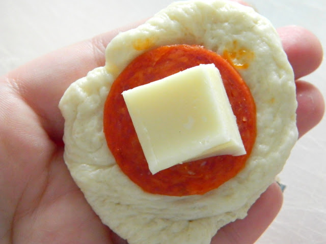 To create the balls break off a hunk of dough. Place the pepperoni then the piece of cheese before rolling or folding into a ball. Make sure you seal the ends as you go. Keep doing this until you’ve used up all of your cheese.