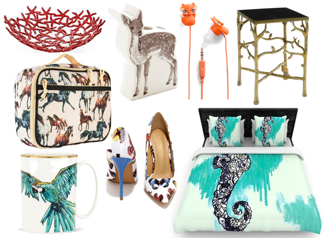 DwellStudio Chinoiserie Bird Table | KESS InHouse Seahorse by Sonal Nathwani Fleece Duvet Cover | Wildkin Horse Dreams Lunch Box | Kate Spade Zoo Drive Parrot Mug | One Kings Lane 10″ Starfish Bowl | Fly Girl White Butterfly Print Pumps | Storybook Deer Charm Vase | The Fox and the Sound Earbuds