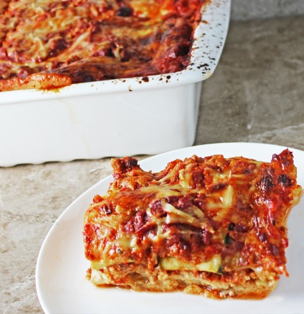 - Your next layer will be the slices of zucchini. Switch of with the noodles & zucchini. I like to add a bit of extra zucchini for the density- it also makes it hold together better!